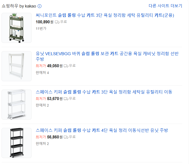 - 장점: 3~4단 슬림 카트를 밀어 넣으면 여분의 두루마리 휴지나 세제를 깔끔하게 숨길 수 있습니다. 필요할 때만 당겨 쓸 수 있어 이동성도 훌륭합니다.