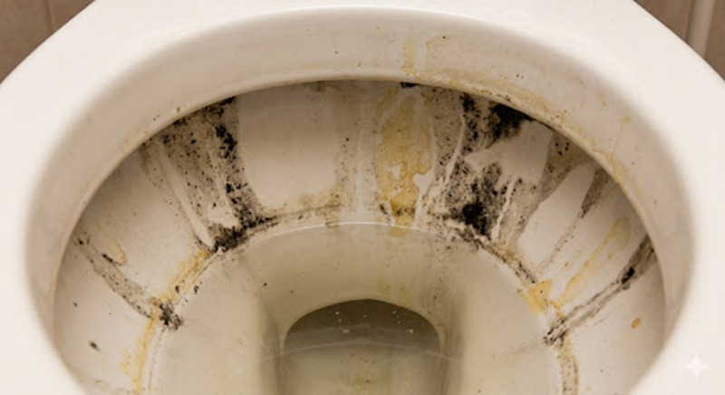 청소 전 변기의 상태입니다. 변기 안쪽 물이 차오르는 경계선과, 물이 나오는 테두리 안쪽을 따라 거뭇거뭇한 곰팡이와 누런 물때(요석)가 굳어있는 것을 볼 수 있습니다. 이 오염들은 일반적인 물 내림으로는 절대 지워지지 않습니다.