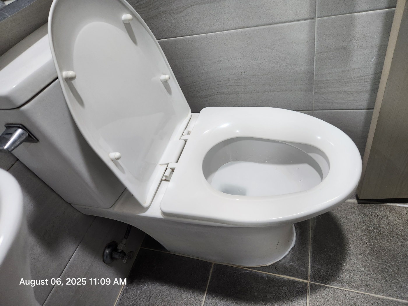 솔질을 마친 후 물을 내려줍니다. 청소 전(1단계) 이미지와 비교했을 때, 변기 안쪽을 가득 채웠던 거뭇한 곰팡이와 물때가 완벽하게 사라지고 새하얀 세라믹 본연의 광택이 되살아난 것을 볼 수 있습니다.