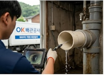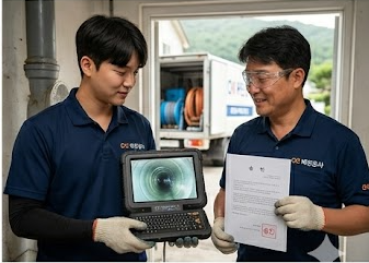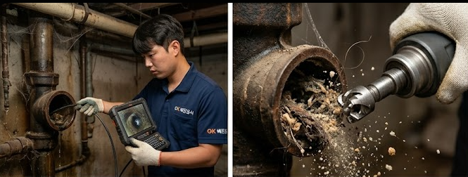 | 작업 효과 | 막힌 '물길'을 뚫어 배수 원활하게 함 | 배관 전체를 '스케일링'하여 근본적 원인 제거 |