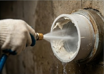 고압 세척은 특수 노즐을 배관에 삽입하여 아주 강한 수압의 물을 사방으로 분사하는 방식입니다. 마치 치과에서 스케일링을 받듯 배관 내벽에 들러붙은 오염물을 칼처럼 잘라내고 씻어냅니다.