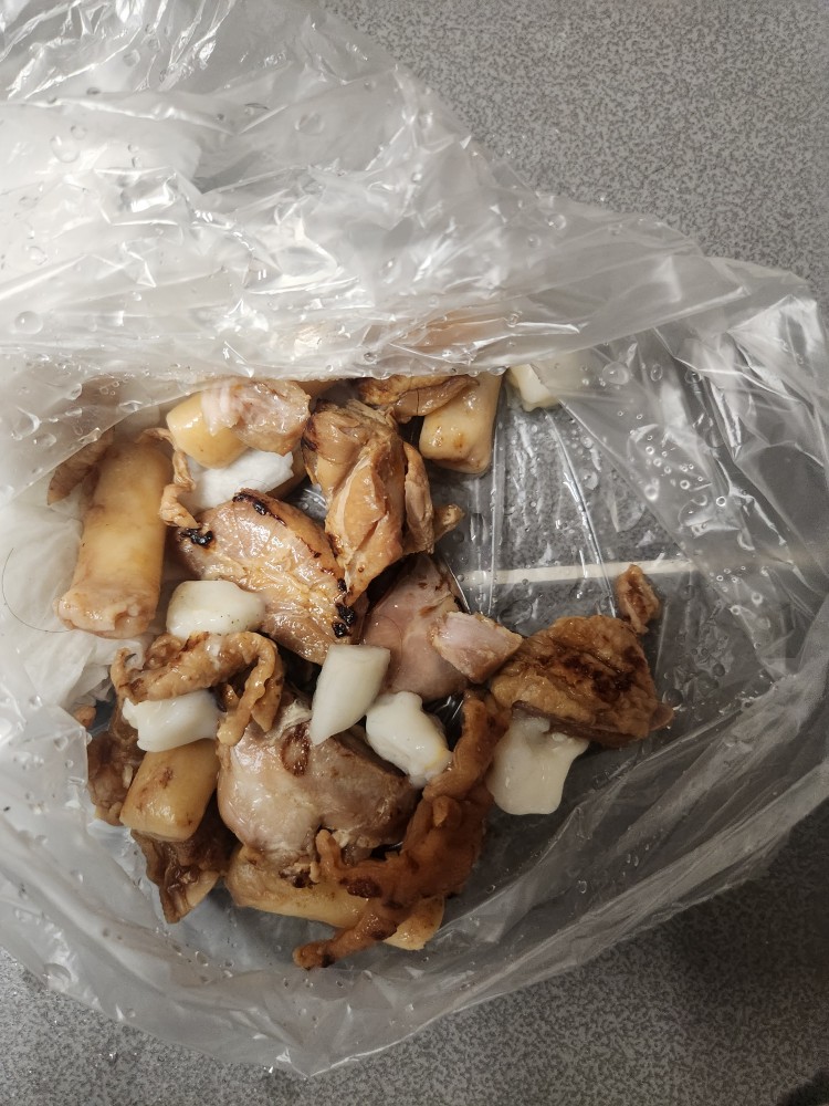 공업용 흡입기로 여지없이 뽑아내려니 큰 닭고기덩이와 떡이 우스스 들어왔습니다